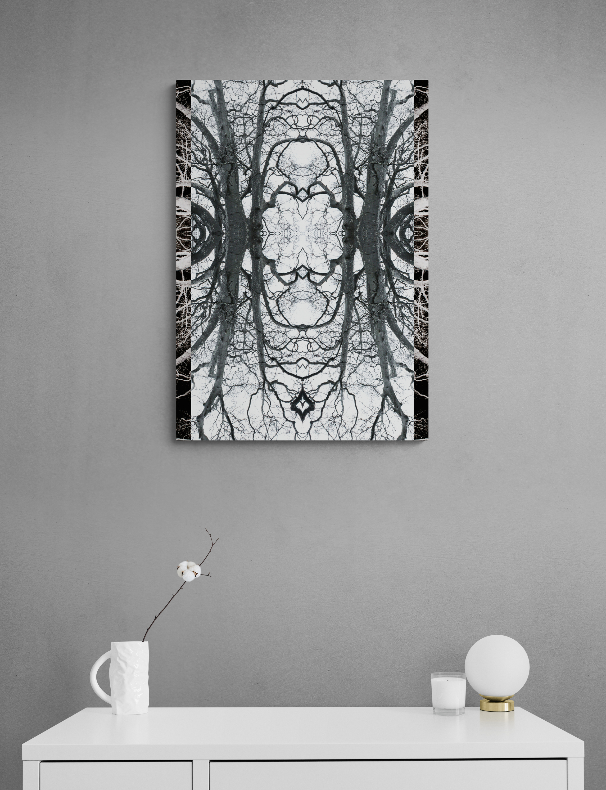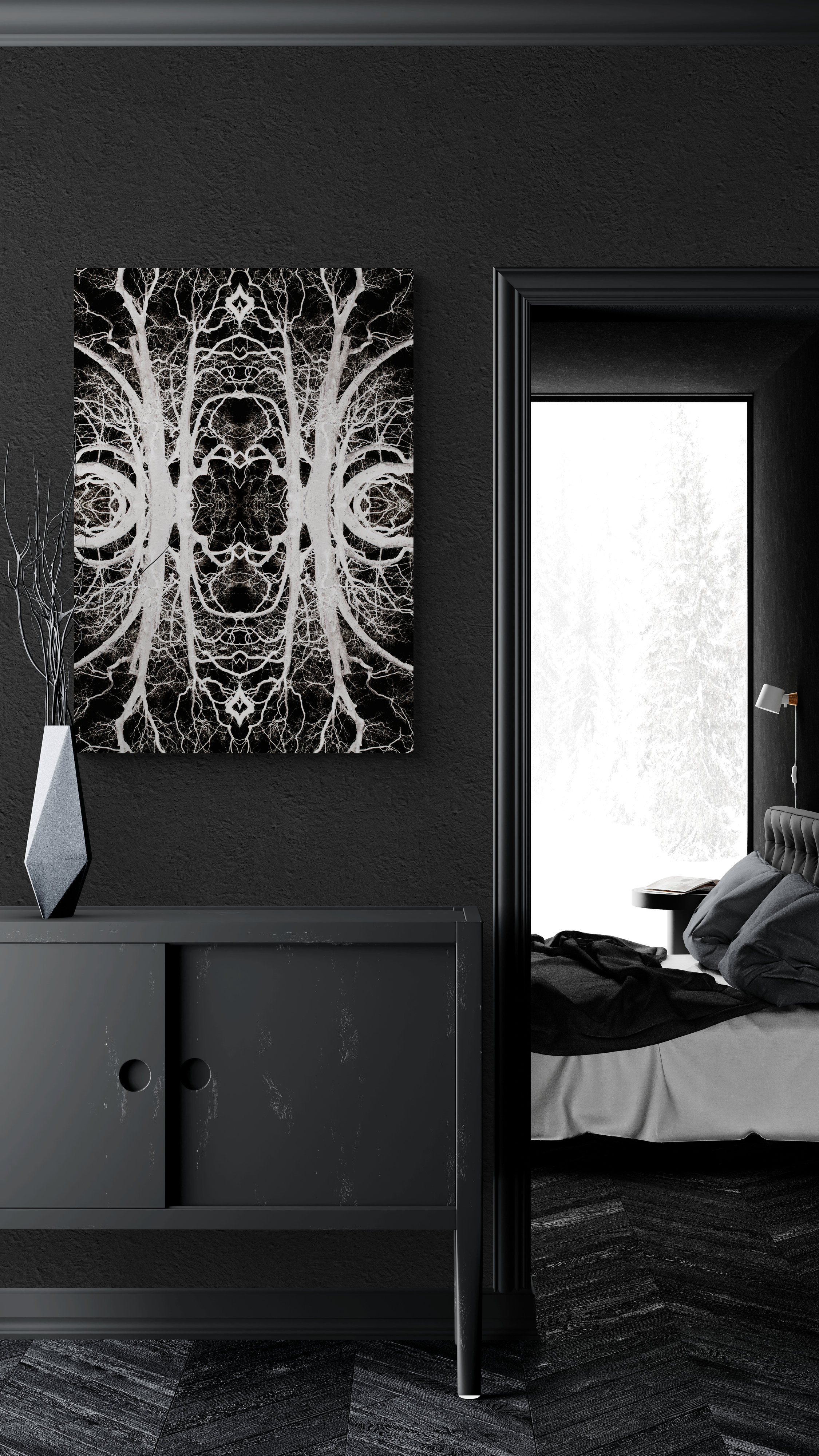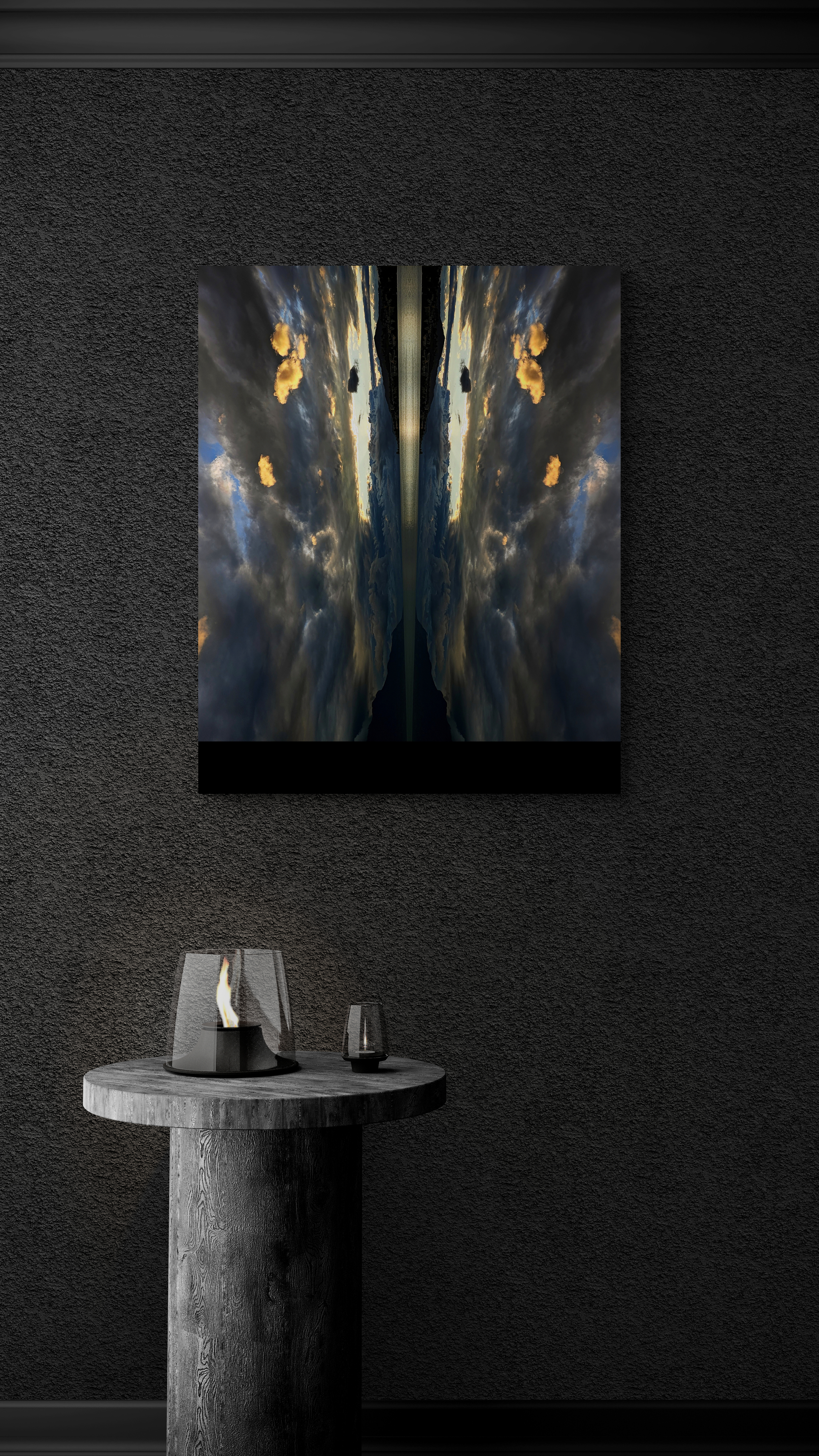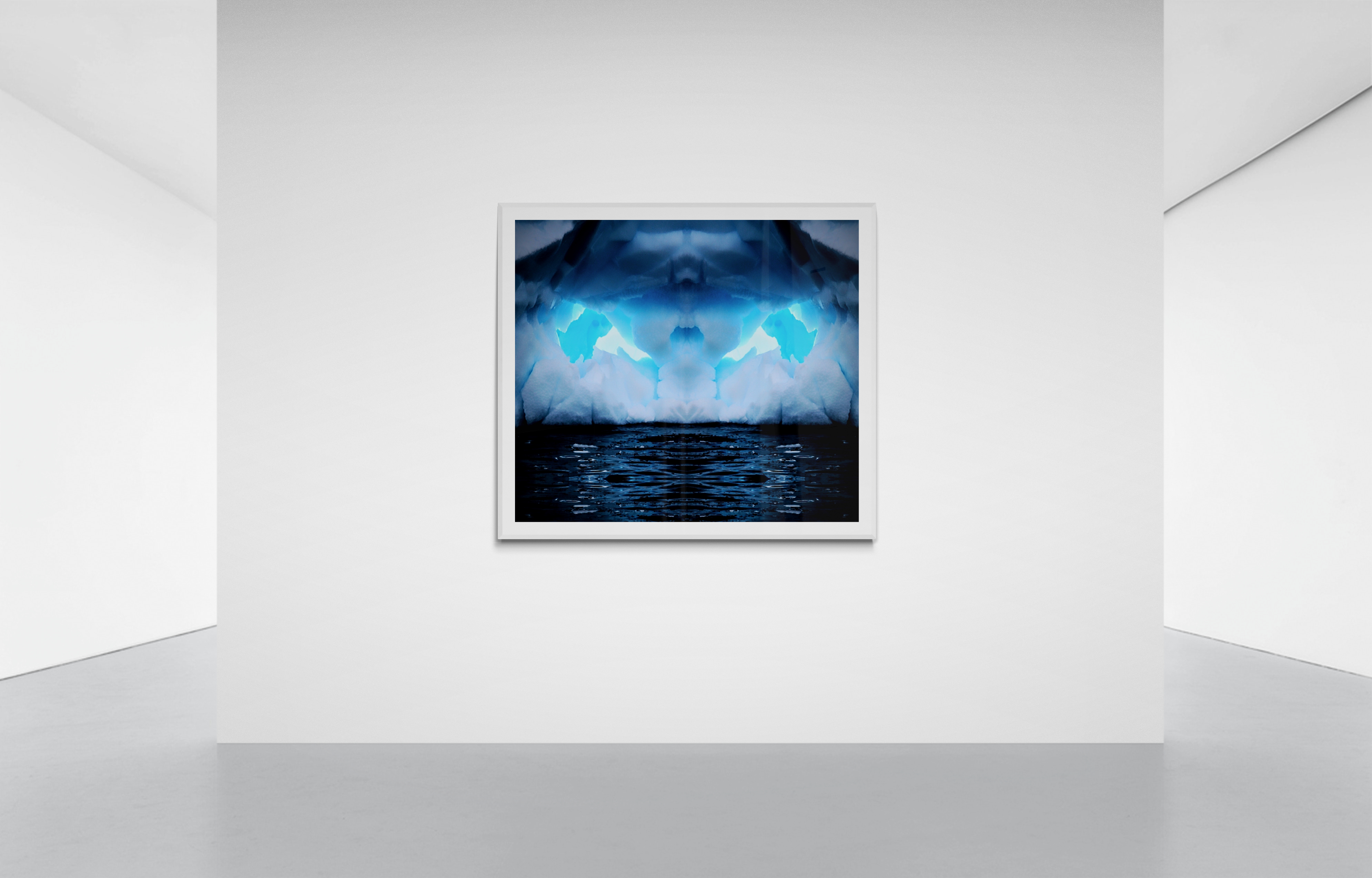 Frost Giant is a captivating digital print on photographic paper that evokes the mysterious beauty of icy landscapes. The artwork features a symmetrical composition, with massive ice formations creating an illusion of a colossal figure emerging from a frozen realm. Shades of deep blue and icy white interplay, enhanced by the soft glow of light filtering through the ice, which gives the piece an ethereal quality. Reflections in the dark water below add depth and contrast, heightening the sense of awe and solitude. Frost Giant invites viewers to experience the vastness and haunting majesty of nature’s icy domains.